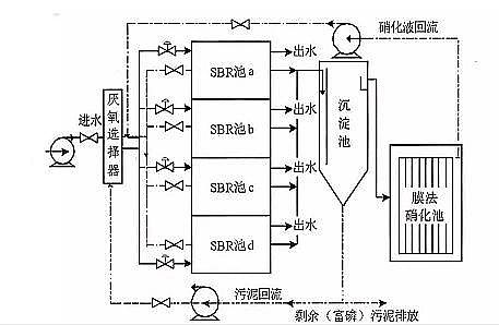 雙循環(huán)兩相生物處理工藝(BICT)是在序批式活性污泥法的基礎上,增設獨立的生物膜硝化反應器,使自養(yǎng)硝化菌與反硝化菌、PAOs 等異養(yǎng)菌分相培養(yǎng),以克服脫氮與除磷間的 SRT 矛盾及硝酸鹽、 DO 干擾釋磷而開發(fā)的污水處理新工藝,其主體單元由厭氧生物選擇器、序批式懸浮污泥主反應器、生物膜硝化反應器組成。